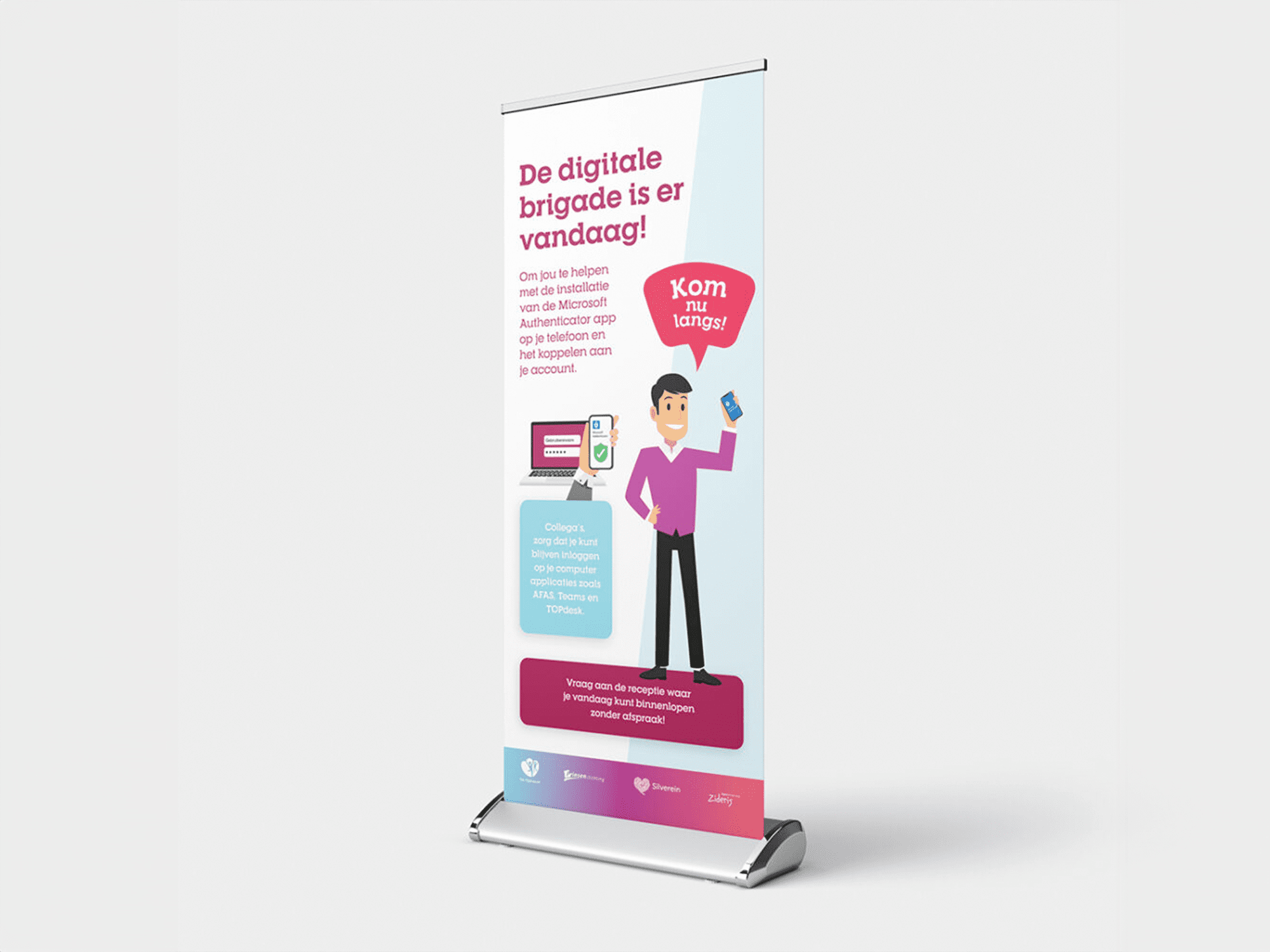 Een banner -en later ook een poster- om aandacht te vragen voor het bezoek van de “digitale brigade”, welke collega’s zou helpen met het installeren van een verplichte applicatie. Hoe handig!