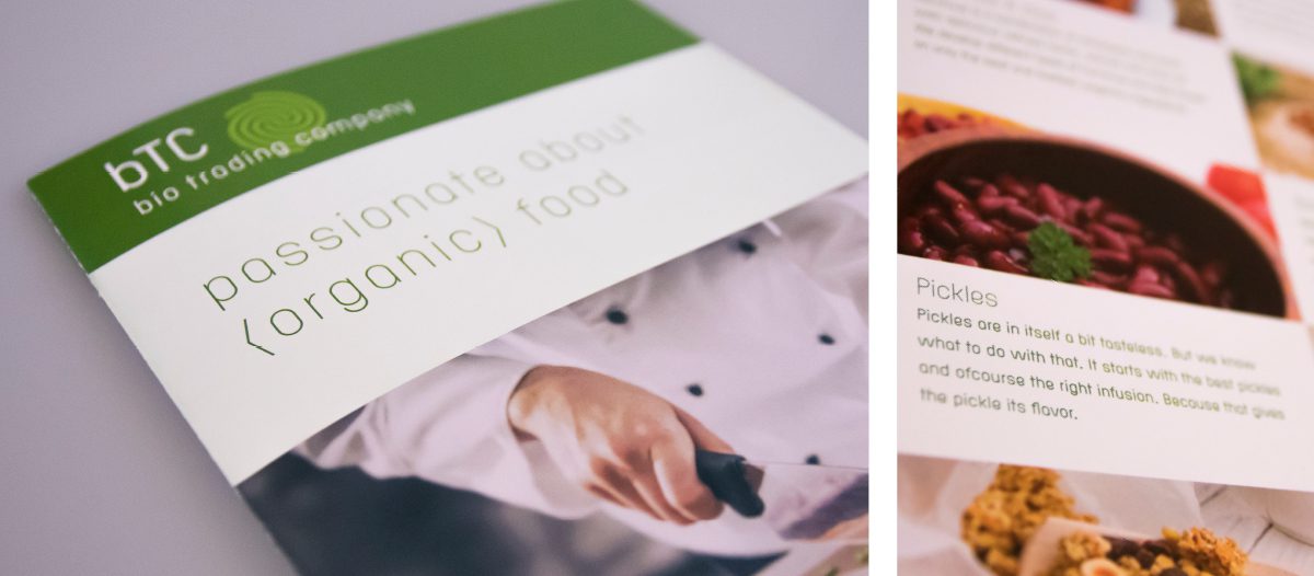 Bio Trading Company ging de beurs op om het merk te promoten. Hiervoor mochten wij meerdere print items ontwerpen en realiseren! Kenmerkend voor deze middelen zijn de groene kleuren en de vingerafdruk die terugkomt in het logo. We hebben de groene kleuren afwisselend terug laten komen om herkenbaarheid te creëren. De groene vingerafdruk komt terug als een soort watermerk. De opmaak vormt samen met de foto’s van eerlijke en pure producten een mooi, groen geheel!