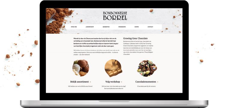 Bonbonnerie Borrel maakt de vertrúffelijkste chocoladecreaties van Zwolle en omstreken. We hebben een frisse, nieuwe website voor ze neergezet. Met hier en daar een duidelijke hoofdrol voor heerlijke traktaties, natuurlijk. Jammie!