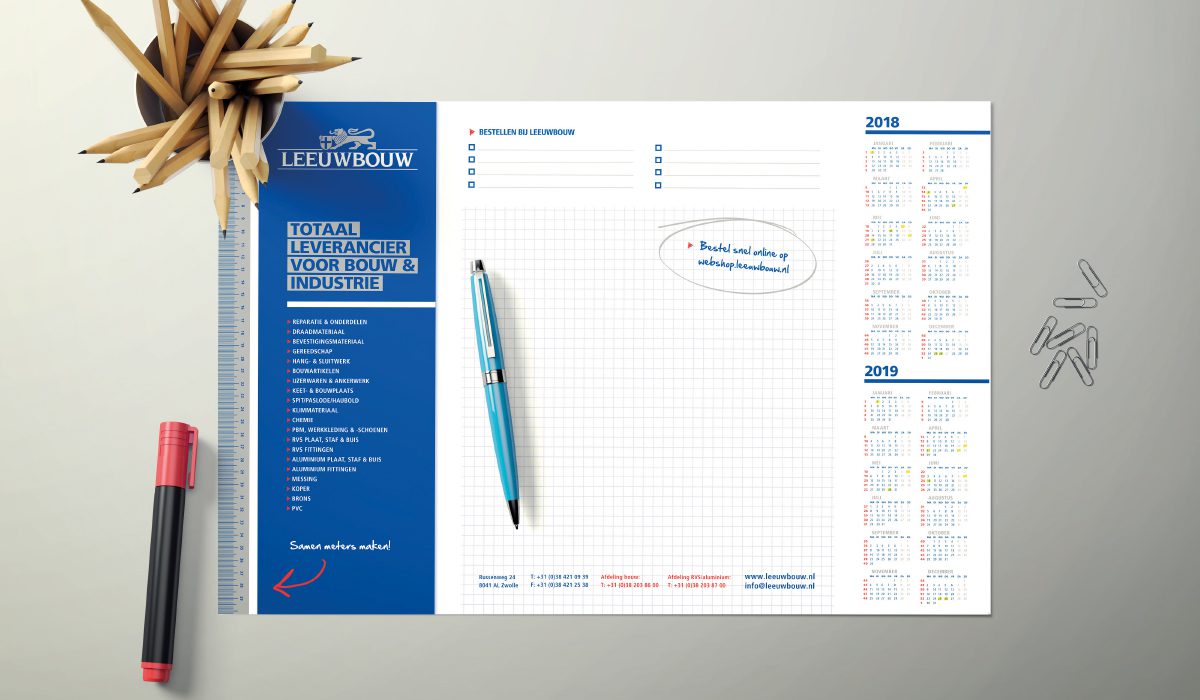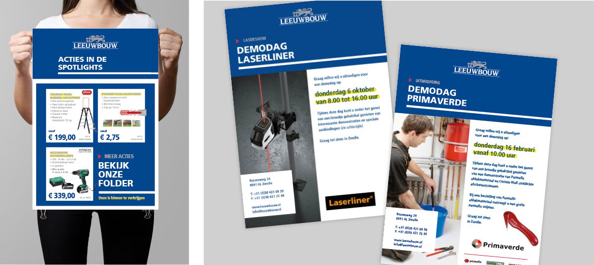 Leeuwbouw levert alles voor de bouwplaats en industrie. Wij ontwerpen allerlei communicatie-uitingen voor deze technische groothandel. Van poster tot aanbiedingsfolder en van kalender tot rolmaatsticker. Ook de website is van onze hand! Neem je een kijkje?