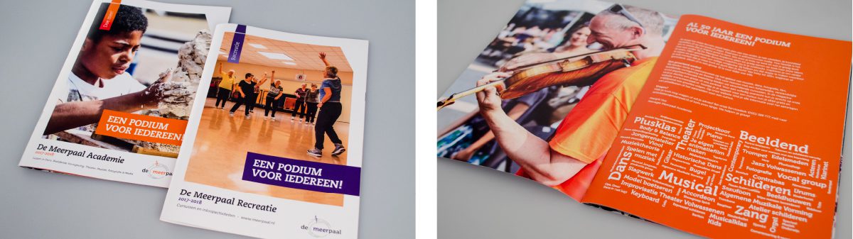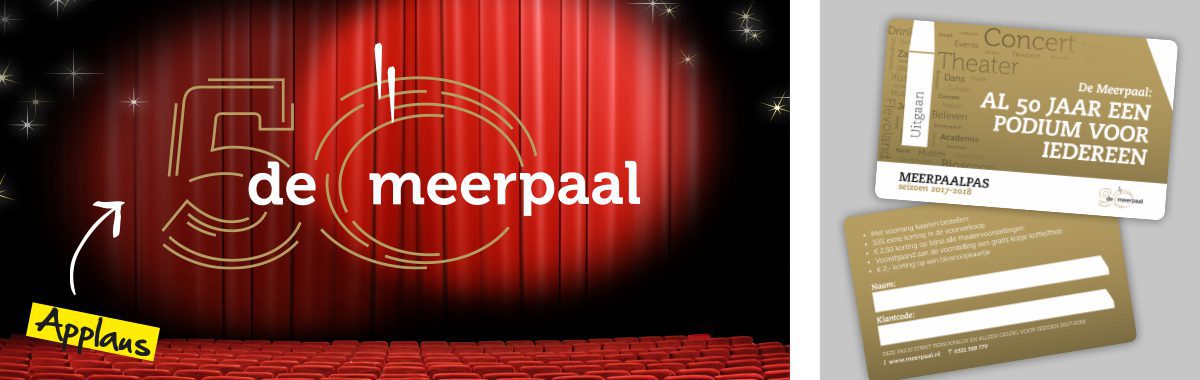 We maken van álles voor de Meerpaal: cultureel centrum en evenementenlocatie in Dronten. Zo zetten wij onder andere onze tanden in de nieuwe brochures voor het theaterseizoen, maken we banners voor aan de gevel en bedenken we concepten voor de uitstraling van lespakketten.