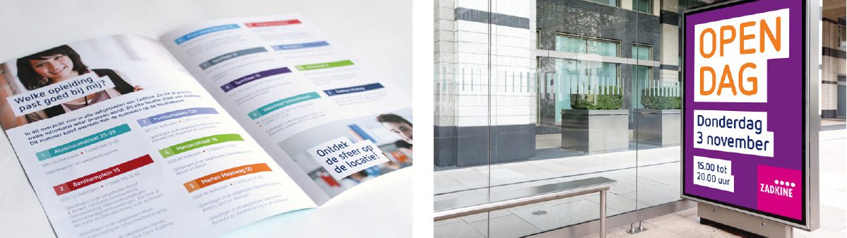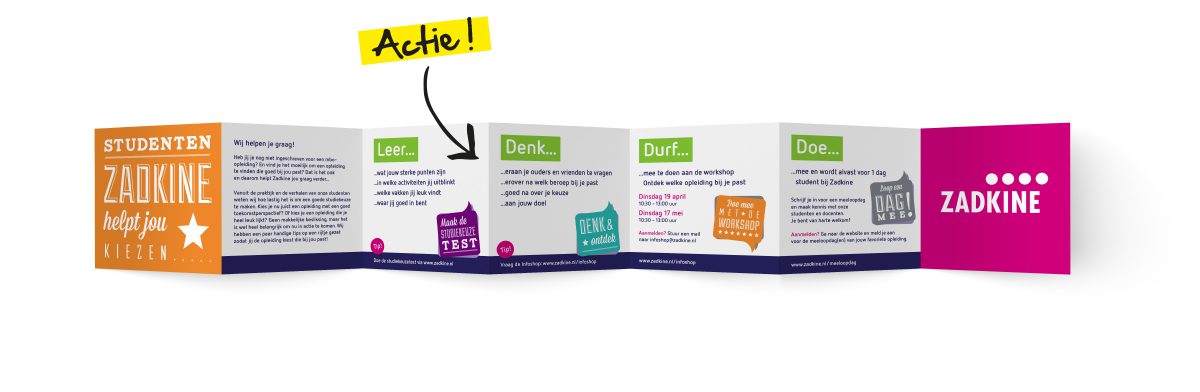 Een andere leuke opdracht was de wervingsactie. Zadkine stuurde vrolijke pakketjes naar decanen op (v)mbo-scholen in de omgeving van Rotterdam. Decanen kunnen deze zigzagfolders meegeven aan leerlingen die zich nog niet hebben aangemeld voor een vervolgopleiding. Leerlingen worden zo met handige tips geholpen om de juiste studiekeuze te maken. We hebben de slogan van Zadkine (leren, denken, durven, doen) vertaald naar een stappenplan. En er is ook aan de ouders gedacht: op de achterzijde krijgen zij tips om hun kinderen goed te begeleiden. Kiezen maar!